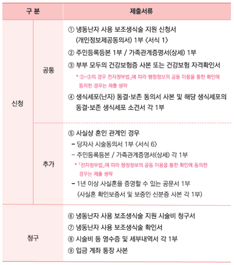 냉동난자 사용 보조생식술 지원을 위해 필요한 서류는 다음과 같습니다. 모든 서류는 신청 시점에 맞춰 준비하고, 미비한 부분이 없도록 꼼꼼히 확인해주세요.