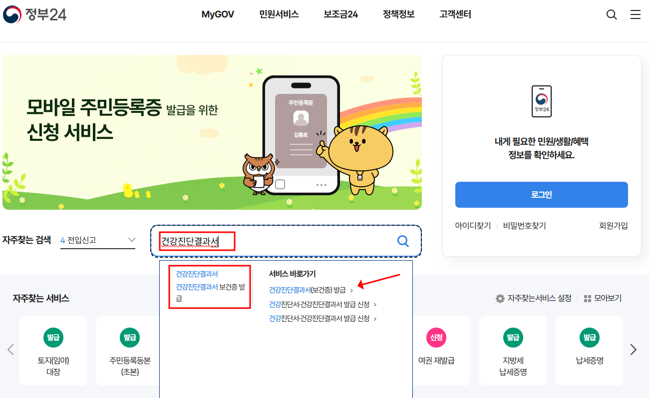 - 검색창에 '건강진단결과서' 입력 후 검색