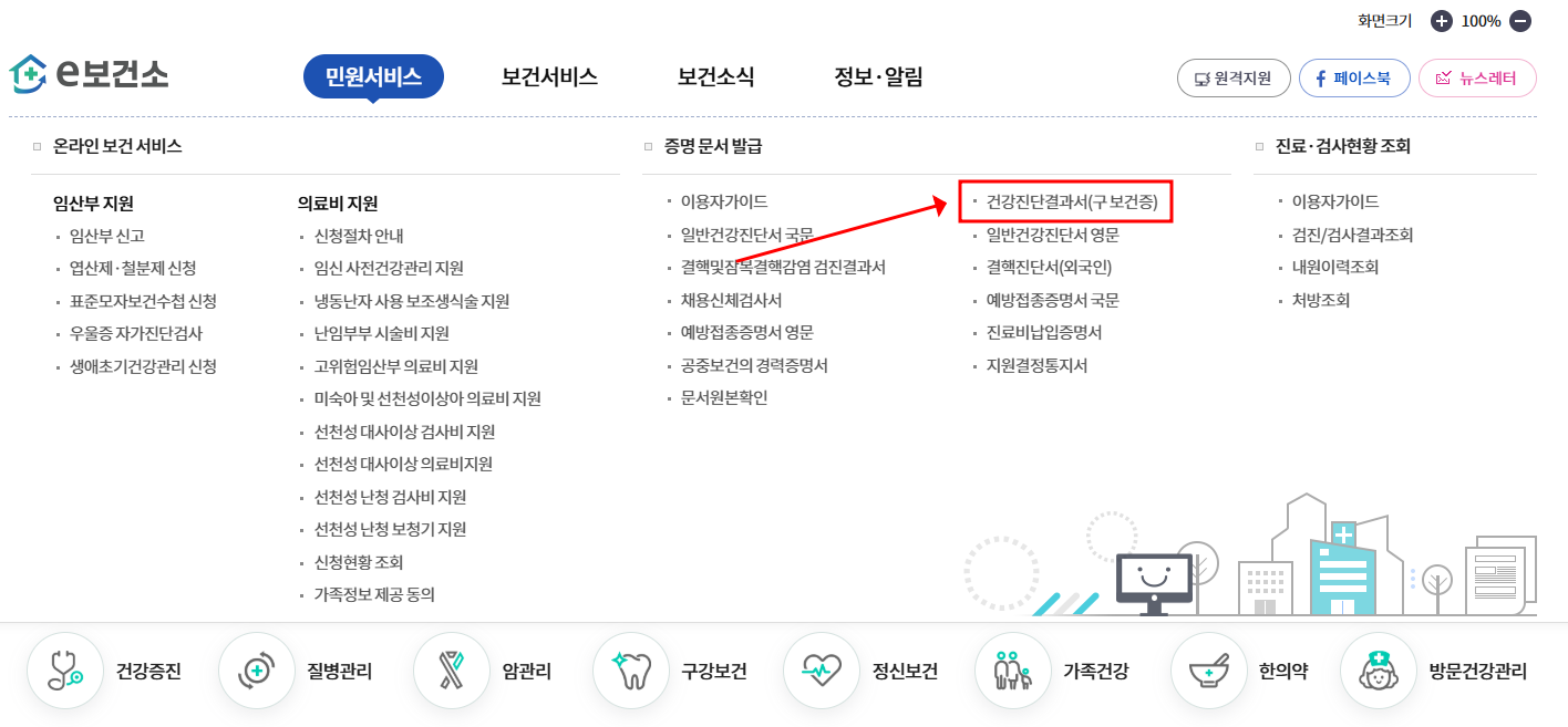 - 민원서비스 > 제증명 발급 > 건강진단결과서 클릭
