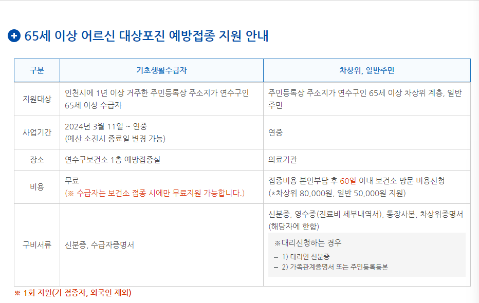 - 신분증과 수급자증명서를 지참하고 연수구보건소 1층 예방접종실을 방문하여 무료 접종을 받을 수 있습니다.